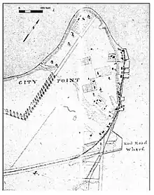 The City Point Railroad was an eight plus mile railroad in eastern Virginia established in 1836 which ran from City Point (now part of the independent City of Hopewell) on the navigable portion of the James River to Petersburg, Virginia. It was surveyed in 1836 to not need more than around 20 ft of grade every mile and only gentle curves. John Couty, the chief engineer, had previously improved the Upper Appomattox Canal Navigation System in 1830.[4] The debt needed to build the railroad was made greater by the Panic of 1837.[5] The City point Railroad began to operate on September 7, 1938. The railroad started at City Point, where the Appomattox River runs into the James River because the Appomattox River was not as deep and wide as would allow large ships to dock closer to Petersburg.