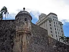 San Juan remains the only walled city under the United States jurisdiction, with walled cities like Boston, Charleston and New Orleans no longer having walls after the 18th century, although St. Augustine, Florida still retains several wall remnants.[3][4][5] Examples of other North American walled cities that retain their ramparts are Quebec City in Canada and Campeche in Mexico.[6][7] The bartizans (garitas) found along the walls are considered emblematic of the city of San Juan and a symbol of historic heritage preservation in Puerto Rico.[8][9]