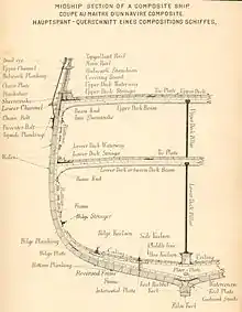 City of Adelaide is a composite ship with timber planking on a wrought-iron frame. This method of construction provides the structural strength of an iron ship combined with the insulation of a timber hull. Unlike iron ships, where copper would cause corrosion in contact with the iron, the timber bottoms of composite ships could be sheathed with copper to prevent fouling. The iron frames meant that composite ships could carry large amounts of canvas sail. Composite ships were therefore some of the fastest ships afloat.[7]