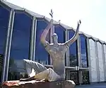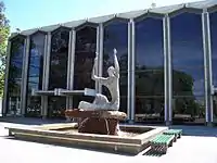 The administration building was officially opened on 2 December 1963.[28] It was built to house the majority of council's staff and departments, and was a two-storey square block with an external colonnade and basement level for parking.[29] The rates, health & building, and Town Clerk's departments were located on the ground floor, while the upper floor contained the engineering and planning departments. The building's main lobby featured a mosaic mural by Michael Santry depicting the history of Bankstown, in addition to marble-clad columns, timber panelling, and terrazzo floors.[29] In 1964, the exterior lighting of the Civic Centre received an award for meritorious lighting from the Australian Illuminating Engineering Society.[28] In 1966 a new fountain, the "Dane Fountain", was unveiled outside the building to commemorate the service of H. W. Dane as administrator of the council.[28]