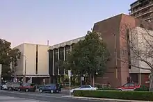 The final element of the Civic Centre to be completed was the town hall, designed as a theatre for 1,500 people, at the north-western end of the site. It was officially opened on 30 June 1973 by Prime Minister Gough Whitlam.[28] The Town Hall project was overseen by Civil and Civic (a Lendlease subsidiary).[39] In 2013, the Town Hall was upgraded and redeveloped as part of the Bankstown Library and Knowledge Centre project to become a 300-seat theatre named the "Bryan Brown Theatre", with the eastern side demolished and replaced by a new Library and "Knowledge Centre".[40][41][42]