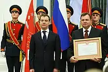 Volokolamsk was conferred the status of “City of Military Glory” by President Medvedev on March 25, 2010, for “courage, endurance and mass heroism, exhibited by defenders of the city in the struggle for the freedom and independence of the Motherland”.[46] A ceremony was held in the Moscow Kremlin on May 4, 2010 at which the city was represented by Head of Volokolamsky District, Vyacheslav Karabanov, and Pavel Osipov, a veteran from World War II. At the ceremony Dmitry Anatolyevich Medvedev said that the exploits of the Panfilovtsy “became a true symbol of courage and selflessness”.[25][47]