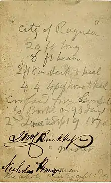 City of Ragusa of Liverpool was a 20-foot (6 m) yawl (in 19th-century terms),[2][3] owned by Nikola Primorac, which twice crossed the Atlantic in the early days of 19th-century small-boat ocean-adventuring. She carried the former alternative name of Dubrovnik, the birthplace of her owner. She was originally a ship's boat of a merchantman. The 1870 east-west trip between Ireland and the United States was crewed by John Charles Buckley, a middle-aged Irishman with seagoing experience, and Primorac, a Croatian and tobacconist. The crew on the west–east return trip of 1871 were Primorac and a "lad" called Edwin Richard William Hayter from New Zealand, who had been a steward on the steamer City of Limerick of the Inman Line.