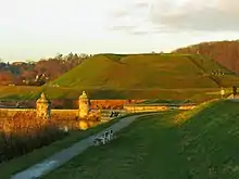 Building of city walls in Danzig began in 1343. The main wall, moat and outer wall were completed in 1380. The medieval wall became obsolete during the 16th century due to the development of artillery.[1] The city began to build a modern fortification in late 16th century and it took decades to finish. Danzig was surrounded by a bastion fort and a stone lock was built in Motława, which could be used to flood the surroundings of the city.[2] Most of the fortifications were demolished during the 1920s.