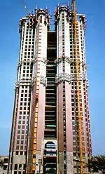 The façade of the building is of Brazilian red granite, and the first four floors are finished in pink and white marble, imported wood paneling and decorative tile. Elevators are lined with brass, polished wood and stone, and cut mirrors.[3]
