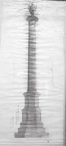 Architect and sculptor Benjamin H. Latrobe created the design of the column for the Pennsylvania Bank. The monument architect was Francis R. Stebbins of Adrian Michigan. The column was donated to the association by a joint act of Congress, (No-78) dated July 27, 1868. The sandstone base and urn at the top came to a cost of $10,000 raised by the monument association. The monument was unveiled in Monument Park on July 4, 1870 by the Adrian Soldiers’ Monument Association. It was the second such commemorative monument erected in Lenawee County following the war — the first being a cemetery monument erected in nearby Franklin Township.[4]
