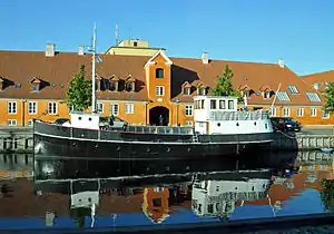 The long main building facing the canal was originally designed by Jacob Fortling. shortly before his death in 1761, and subsequently completed by court architect Georg David Anthon, roughly to that design, in 1771.[1] The complex was used for the storing of materials and building parts and furnishings for the royal palaces and other buildings. The ring riding columns and marble balls in Rosenborg Castle Gardens are examples of artifacts at some point stored at Civiletatens Materialgård.[2][3]