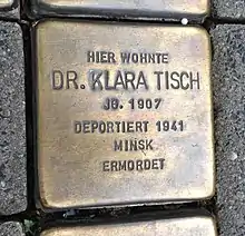 On 10 November 1941, Tisch was deported together with her sisters Marie and Gerda, her brother-in-law Leo Marcus, and her niece Arnhild Marcus in a group of 992 Jewish co-citizens from Wuppertal, Düsseldorf, and Essen to the Minsk Ghetto, where she was murdered very likely in 1942 or 1943.