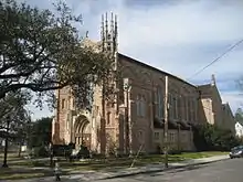 Claiborne Avenue was once a neutral ground and main street for Tremé, the oldest African-American neighborhood in the United States. In the 1950s, this avenue served as a community space lined with large oak trees and azalea gardens.[1][2] During Carnival season, families would camp out, barbecue, and wait for the Mardi Gras parades to pass by.[3] Due to racial segregation and Jim Crow laws in the South, African-Americans were not permitted to shop at white-owned stores. This resulted in the birth of the African American business district on Claiborne Avenue.[4] This historic strip included a plethora of booming African American-owned businesses such as: theaters, drug stores, insurance companies, restaurants, and toy stores that occupied the space.[1][3] At the intersection of St. Bernard Avenue and Claiborne was the St. Bernard Circle.[4] The intersection bustled with activity around the famous Circle Food Store in New Orleans' historic Seventh Ward. This store was incorporated in 1938 and was New Orleans' first African American-owned full-service grocery store. The Circle Food Store provided groceries—"It stocked local staple foods and was even known to carry wild game"[5]—a pharmacy, a doctor, a dentist, a chiropractor, check cashing and banking, and a place to buy school uniforms.[6]