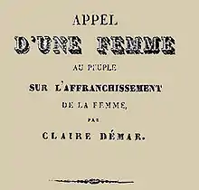 Claire Démar (1799–1833), was a feminist, journalist and writer, member of the Saint-Simonian movement. The avant-garde nature of her writings has led to her current recognition.[1]