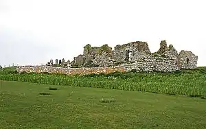 Not long after returning from Ireland, a feud seems to have arisen between Dòmhnall Gorm Mòr and the chief of Clan Macleod, Ruairidh Mòr. The Sleat chief had married the sister of the Macleod chief, and after some time sent her back to Macleod. Tradition has it that she was blind in an eye, and was mounted upon one-eyed horse, followed by a one-eyed dog, and accompanied by a one-eyed man.[7] The Macleod chief was outraged and immediately had Trotternish ravaged. The Macdonalds of Sleat then retaliated by attacking Macleod possessions in Harris. This then led to Ruairidh Mòr leading a warband of 60 men on a raid in North Uist.[30] The Macleod chief's relative, Mac Dhòmhnaill Ghlais ("the son of Dòmhnall the grey"),[note 1] and 40 followers managed to possess themselves of the goods that the Uistfolk has hidden in Teampull na Trionaid ("trinity church"), at Carinish. However, the Macleods were attacked by a celebrated Clanranald warrior, named Dhòmhnall MacIain 'Ic Sheumais, in command of 15 men. The Macleods were outmanoeuvred by Dhòmhnall MacIain 'Ic Sheumais, and were slain almost to a man. Mac Dhòmhnaill Ghlais and a few of his followers fled for the island of Baleshare, but were run-down by some Uistmen and killed on the spot which ever since been known as Oitir Mhic Dhòmhnaill Ghlais ("the strand of the son of Dòmhnall the grey").[7]