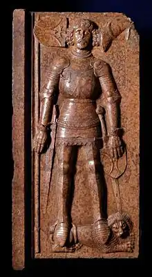 Stibor of Stiboricz died in 1414 and was supposedly laid to rest in his own chapel inside St. Katarina's Church in Krakow. This was also supposedly the resting place for his son. It was also written that both father and son were buried in the chapel until 1903 when a grave of red marble stone was found in Buda. This was of Stibor Stiboric of Beckov, dated to 1431. In recent times, a grave was found in Székesfehérvár which had been broken into pieces as a result of Turkish destruction. However, it has now been established that this was the grave of Stibor of Stiboricz. It was made of the same stone, red marmor and when the piece of coat of arms was finally found and there was no doubt. Stibor was granted a place beside other members of the Hungarian royalty.[72]