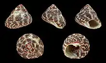 The size of the shell varies between 9 mm and 23 mm. The umbilicate, moderately thick shell has a conoid shape. The five convex whorls are separated by canaliculate sutures. The first whorls are eroded, whitish, the rest roseus, cinereous or brownish, ornamented with a few radiating white streaks. They are spirally granose-lirate with 6 finely beaded lirae on the penultimate whorl, the fifth larger, more prominent, simulating a carina. The body whorl is angulate, plano-convex beneath and concentrically cingulate. The about 7 cinguli are granose with the interstices sometimes bearing concentric lirulae. The aperture is rhomboidal. The lip within is thickened and sulcate. The basal margin is crenulate. The columella is tuberculose, above twisted plicate, below obsoletely truncate. The white umbilical area is spirally plicate with a crenulate margin. The thin parietal callus is wrinkled.[2]