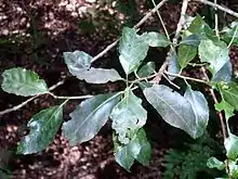 Leaves alternate, simple and toothed in an irregular manner. Oblong or elliptical in shape, 5 to 12 cm long with a blunt leaf tip. Leaf stalks 1 to 4 cm long. Usually with two small glands at the apex. The midrib is paler than the leaf itself, venation is more evident under the leaf.