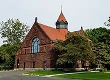 The Clapp Memorial Library is a public library in Belchertown, Massachusetts.[1] Built in 1887 at the bequest of Belchertown native John Francis Clapp, the library is part of the Belchertown Center Historic District. Designed by New York architect H.F. Kilburn, it is built in the form of a Latin cross and features two large, stained glass windows as well as an eighty-foot-high tower in the center of the building.[2] Constructed by the Bartlett Brothers of Whately, MA, the building features primarily local materials, including the brownstone from Longmeadow, MA, the brick trim from Holyoke, MA, and the stained glass windows, made from sand and silica from Western Massachusetts.[3] The first librarian was Lydia A. Barton, who served from 1887 until her death in 1911.[4] The building is not owned or maintained by the town, but rather by the Trustees of the Library.[5]
