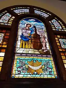Clapp Memorial Library north window depicting Saint Cecilia, patroness of music. It is thought to have been fabricated by H.E. Hartwell, a New York decorator and designer, and was presented to the library by Susan Bridgman, one of the original library trustees.