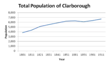Population change in Clarborough has followed a similar trajectory to that of England as a whole, although there has been a greater amount of fluctuation. One reason for this is that Clarborough has a smaller population, therefore any change would be more recognisable. In 1881 there was a national decline in population change with England overall declining by 3%, whereas Clarborough declined overall by 6%, reaching its lowest rate of change being −3%. Since this period the population has peaked higher than the original rate to 6% in 1901, and has remained steadily in parallel with the rest of England and Wales.[25]