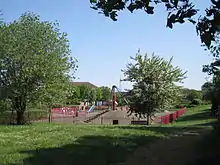 It was developed on former wasteland, and has mown grassland, a children's playground and sports facilities.