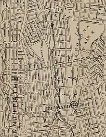 Claremont Park is a 38-acre (15 ha) park in the Morrisania section of the Bronx. It is roughly triangular and has been described as "ham-shaped".[1] The park is bordered by Mt. Eden Avenue (previously known as Belmont Street) on the north, Morris and Teller Avenues on the west, E 170th Street on the south, and Clay Avenue on the east.[2]: 319 It sits atop a ridge which overlooks the modern Webster Avenue; at one time this had been Mill Brook, which no longer exists.[2]: 289