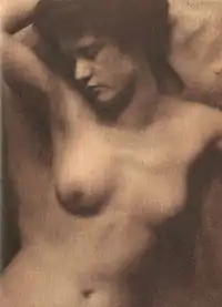 White did not record how soon he took up photography after he and his wife returned to Newark, but it had to have been quickly. There are at least two photographs taken by him that date from that same year, 1893, and by the following year he was deeply engaged in his new interest.[5] White's grandson wrote, "It is not coincidental that Clarence White's life in photography began in the year of his marriage. My grandmother wore a great many hats, and all with real flair; she was wife, mother, business manager, model, aesthetic critic, stoic, and a buffer between my grandfather and many of the unpleasantnesses of life. With steadfast devotion, she created an environment in which he could lead a calm and productive life."[6] The considerable influence of his wife in White's artistic development may be seen later when he began corresponding with Alfred Stieglitz; White often used the words "we" or "Mrs. White and I" when describing his most recent photographic activities.[6]