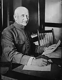 Edwards' final demise came in October 1918, when he reported an incident to Liggett involving information two of his soldiers had obtained from German soldiers with whom they had been fraternizing. The Germans had expressed their belief that the war would be over soon, and that they were reluctant to continue fighting. While Edwards thought he was reporting the enemy's poor morale to Liggett, he instead gave Liggett an excuse to get rid of Edwards for his zeal in supporting the National Guard. Liggett reported the incident to the AEF commander, General Pershing, who took the opportunity to act on his personal vendetta and relieve Edwards of his command.[16] His successor was Brigadier General Frank E. Bamford, formerly the commander of the 1st Division's 2nd Brigade who had been informed that he would be getting, apparently, "the worst division in the AEF." Somewhat strangely, Edwards, who had a history of saying whatever was on his mind, did not say anything at all about his dismissal from command, choosing instead to simply say nothing.[17]