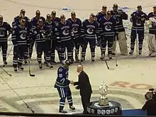 A traditional superstition that is prevalent among many of today's NHL players is that no player should either touch or hoist the Campbell (Western Conference champion) or Prince of Wales (Eastern Conference champion) trophies after they have won the conference playoffs; these players feel that the Stanley Cup is the true championship trophy and thus it should be the only trophy that they should be hoisting. Instead of touching the conference trophy, the captain of the winning team merely poses (usually looking solemn) with the trophy, and sometimes, the entire team poses as well. There have been other teams, however, that have ignored the superstition and hoisted the conference trophy and then went on to win the Cup anyway.[2][3][4]