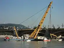 Clark Ádám is a crane vessel, specifically a floating sheerleg, built in 1980 in Budapest, Hungary, by the Hungarian Shipyards and Crane Factory (Hungarian: Magyar Hajó- és Darugyár; MHD) Angyalföld Division. It originally had a lifting capacity of 120 metric tons, gradually raised to 200 tons by 2006,[3] making it one of the largest in lifting capacity on Central European rivers.[4][5] It is mainly used for building bridges, but is also commissioned to assist salvage operations, as well as to launch hydrofoils. It has rescued several ships; in 2019 it raised the sunken Hableány from the Danube at Budapest. The vessel is named after Scottish engineer Adam Clark (1811–1866).[2]