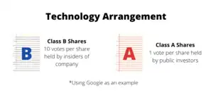 The technology class arrangement derived its name from its popularity amongst technology companies. It usually involves insiders of a company having control over their Class B shares. The Class B shares have about 10 times the voting power of Class A shares, and are not traded on public exchanges. These shares are called "super-voting shares" as they give key company insiders larger control over the company which includes its board and is usually the deciding factor for corporate actions.[33] Hence, the "super-voting shares" are usually not publicly traded.[34] One popular example would be the” Google Share Class Structure”.[32] The purpose of this structure is argued to ensure stability of the company and prevent the board and management from feeling short-term pressure, which in turn allows them to focus on long-term goals.[35]