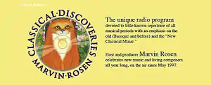 Because of its unique and unconventional approach to classical radio, the program has caught the attention of many newspapers, Internet magazines, and blogs. "It's a combination of public and global service that Marvin Rosen does for contemporary music." states Susan Van Dongen of Time Off (of the Princeton Packet).[25] In August 2008, Jeff Rosenfeld of The San Francisco Classical Voice named Classical Discoveries as one of his recommended sources of Internet radio and in April 2010, Rosen appeared as a guest on Jersey Arts: The Podcast for an interview with Susan Wallner. The podcast was a highlighted discussion about Classical Discoveries and Rosen's work as being a long time radio host with WPRB 103.3 FM.[26] In addition, Azerbaijan International Magazine recognized Rosen as being the first in the history of classical radio in the United States to present a vast amount of music of their country. In August 2004 Rosen presented 5 hours of uninterrupted classical music by Azeri composers.[27]