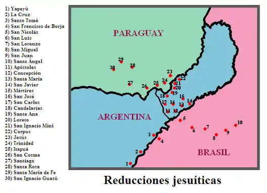 After the expulsion of the Jesuits, the residents of the reductions emigrated gradually towards territories of current Paraguay, Corrientes, Uruguay, Entre Ríos and those to the North of Río Salado. These migratory moves caused a one-sided change in the language, making it stray far from the original dialect that the Jesuits had studied.[3][4]