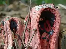 Clathrus columnatus, commonly known as the column stinkhorn, is a saprobic species of basidiomycete fungus in the family Phallaceae. It has a widespread distribution, and has been found in Africa, Australasia, and the Americas. It may have been introduced to North America with exotic plants. Similar to other stinkhorn fungi, the fruiting body, known as the receptaculum, starts out as a subterranean "egg" form. As the fungus develops, the receptaculum expands and erupts out of the protective volva, ultimately developing into mature structures characterized by two to five long vertical orange or red spongy columns, joined at the apex. The fully grown receptaculum reaches heights of 8 cm (3.1 in) tall. The inside surfaces of the columns are covered with a fetid olive-brown spore-containing slime, which attracts flies and other insects that help disseminate the spores. Although once considered undesirable, the fungus is listed as edible. It is found commonly in mulch.