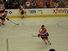 Things began turning upwards for Giroux during the 2017–18 season, as he moved from center to wing.[34] This allowed Sean Couturier to move up to the top line, and both players had career years as a result. He was named to the 2018 NHL All-Star Game for the fifth time in his career during this season.[35] This also made him the first Flyers skater since John LeClair and Eric Lindros to be selected for the All-Star Game roster five or more times.[35] On March 13, 2018, after the Philadelphia Eagles released Brent Celek, Giroux became the longest tenured professional athlete in Philadelphia.[36] On March 20, 2018, Giroux passed Eric Lindros for 5th on the Flyers' all-time scoring list. He recorded an assist on Sean Couturier's goal to record point 660.[37] Near the conclusion of the regular season, Giroux was nominated for the Bill Masterton Trophy,[38] and was later awarded the Bobby Clarke Trophy and the Toyota Cup award.[39] In the final game of the regular season, Giroux became the 6th player in Flyers franchise history to reach the 100-point mark in a season, recording a power-play goal in the second period of a 5–0 win against the New York Rangers.[40] He was the first Flyers' player to reach 100 points in a season since Eric Lindros in 1995–96.[41] Giroux helped the Flyers qualify for the 2018 Stanley Cup playoffs, where he recorded 3 points in 6 games in an eventual first round loss to the Pittsburgh Penguins. Following the season, Giroux was named a Second-Team NHL All-Star. He also finished 4th in the MVP voting.[42]