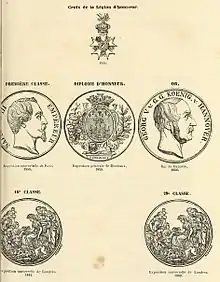 Beginning in 1839, Montal exhibited his own pianos at the Industrial Expositions of Paris, showing off his own, patented inventions in piano and action design.[4] He received his first award (a bronze medal) at the French Industrial Exposition of 1844;[5] was awarded the prize medal at the 1851 International Exposition in London, often called The Great Exhibition;[6] a first class medal at the 1855 International Exposition in Paris;[10] and two additional medals at the 1862 International Exposition in London.[11] Montal received several additional awards, fourteen in all, including that of the Legion of Honor, in 1851.[12]