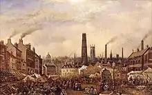One of the Derby exhibits was "Fair-day in the Morledge", depicting a bustling city centre Easter fair, at Derby, see image in the right hand panel. This picture, now in the possession of the Derby Museum and Art Gallery, was exhibited at Mr. Keene’s picture exhibition in Derby,[17] according to the Derby Mercury of 31/05/1882,[18] by T. C. Moore but is now attributed to Claude T. S.