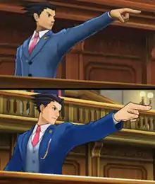 The first thing Fuse and his art team had to do was figuring out how to create 3D models that preserve the look and feel of the previous games' 2D sprites, even when viewed in stereoscopic 3D. Some of the artists on the team created a concept trailer for how the game's visuals would work, featuring a 3D model of Phoenix. Looking back at it, Fuse called the model "cringe-worthy", but it was able to be used as a base. Everyone on the development team gave feedback on the model, and it was continuously refined until everyone was satisfied with its look;[19] this process alone took six months.[13] The art team also wanted to preserve the "lively" style of animation used in the 2D sprites.[19] To do this, they used "various tricks" such as using different character models for different angles.[13] They also took advantage of the increased capabilities of the Nintendo 3DS hardware, and added camera movements and connecting animations to give the character animation further fluidity.[19]