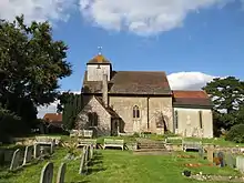 The little parish church of St. John the Baptist is an Anglo-Saxon church that has a squat bell turret of shingles with a wrought iron weather vane dated 1781. The church has some magnificent wall murals, for example the Last Judgement, from the mid-12th century (1150–1200). These murals, unique in England for their date and extent, were first brought to light during repair work in 1893 and were probably painted by artists from St Pancras Priory in Lewes.[4][5] Sir Norman Hartnell, who designed Queen Elizabeth II's wedding gown and coronation dress and served as couturier to Elizabeth II (and previously to The Queen Mother) is buried in the churchyard.