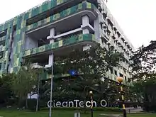 CleanTech Park is an eco-business park in Singapore, the first in the nation.[1][2] R&D and test-bedding site for early adoption of green technology and solutions. Under development in three phases with a proposed completion year of 2030, the Park's first multi-tenanted building, CleanTech One, was opened in October 2010.[2] The 50 hectares (120 acres) site is located adjacent to Nanyang Technological University, which plans an integration between the sites as part of its own expansion.[3] In addition to focusing on hosting environmentally friendly industry, the complex is being developed by JTC Corporation with an eye towards environmentally responsible practices, with "green" buildings and maintenance of natural terrain.[4] Together with other precincts such as Nanyang Technological University, Bulim, Tengah, Bahar and CleanTech Park & LaunchPad @ JID forms the future 600-hectare Jurong Innovation District.[5]