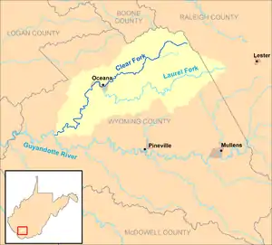 The Clear Fork is a tributary of the Guyandotte River, 29 miles (47 km) long,[3] in southern West Virginia in the United States. Via the Guyandotte and Ohio rivers, it is part of the watershed of the Mississippi River, draining an area of 129 square miles (330 km2)[4] in a rural area on the unglaciated portion of the Allegheny Plateau. The Clear Fork flows for its entire length in Wyoming County; its tributary the Laurel Fork also drains a small area of western Raleigh County.[5]