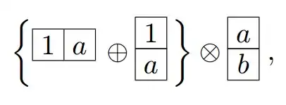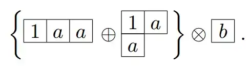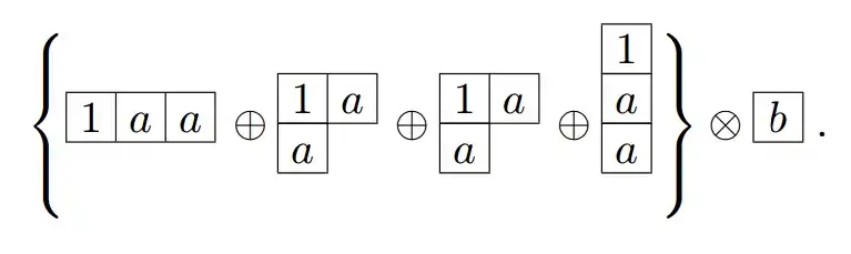 - Write down the two Young diagrams for the two irreps under consideration, such as in the following example. In the second figure insert a series of the letter a in the first row, the letter b in the second row, the letter c in the third row, etc. in order to keep track of them once they are included in the various resultant diagrams: