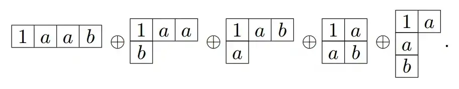 - Take the first box containing an a and appends it to the first Young diagram in all possible ways that follow the rules for creation of a Young diagram: