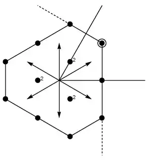 All the other states of the representation can be constructed by the successive application of the ladder operators and and by identifying the base states which are annihilated by the action of the lowering operators. These operators lie on the vertices and the center of a hexagon.