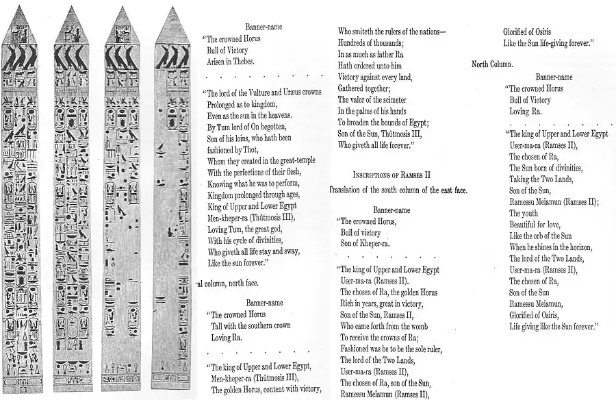 - Farman, Elbert E. (1908). "History of Obelisk and Inscription". Egypt and its Betrayal. New York City: Grafton Press. pp. 189–191. Retrieved March 22, 2023 – via Google Books.