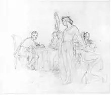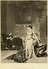 French writer Prosper Mérimée first proposed the subject of Cleopatra and Caesar in a letter sent to Gérôme in December 1860.[4][5] La Païva, a wealthy French courtesan, later commissioned the painting from Gérôme, intending it for display in the Hôtel de la Païva, her mansion on the Champs-Élysées. According to American art critic Earl Shinn, the work was originally painted on silk and was designed as a "transparency to be lowered or raised midway of a long saloon" in La Païva's mansion, "which it was desirable to divide occasionally into two".[6]