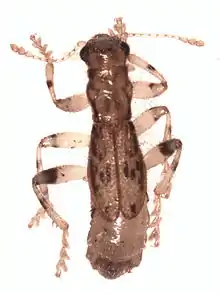 When larvae hatch from their eggs, they are either red or yellow.[11] Their bodies have a slender and flat appearance with short legs due to their minimal movement. The larvae are covered in hair and have two horn-type projections on the dorsal area of the last body segment.[11] Immediately after birth, they start searching for food close to where they hatched. They feed on wood-borer insects on trees, or feed on their species' substrate or prey of choice.[11] Feeding is the main purpose of the larval stage to prepare for pupation. Once their larval stage is complete the tree dwelling species make their way to the bottom of the tree to pupate.[13] The pupal stage can last from 6 weeks to one year depending on the need to overwinter, and how short the overall life cycle is for a particular species. A majority of clerid species pupate in earthen cells which are made from soil and certain enzymes secreted from their mouths.[11] The rest remain in pupal cells. Adult beetles emerge from pupation and spend a variable time of their life maturing, and eventually oviposit. Sexually mature adults or imagos of Thanasiumus overwinter inside the wood-borer-infested trees and oviposit during the spring.[12]