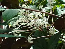 The bronze-leaved clerodendrum is a medium to large-sized shrub growing to a height of about 5 m (16 ft). The branches and twigs are four-sided. The leaves are in opposite pairs and are borne on medium-length petioles. The leaf blades are oblong and up to 20 cm (8 in) long, the upper surface being green and the underside purple; they have rounded bases, wavy margins and pointed tips. The showy flower clusters are borne at the tips of the shoots. Each contains many flowers with slender pink tubes about 7 cm (3 in) long, each terminated by five slender white, reflexed corolla lobes about 1.5 cm (0.6 in) long. The flowers are followed by ellipsoid, capsules containing four seeds.[9] The corolla tubes are exceptionally long and require specialist pollinators.[10]