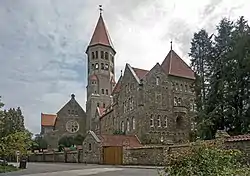 The abbey was founded by the Benedictine monks of the Abbey of St. Maur of Glanfeuil in France, itself founded in the 7th century. After its suppression under the French Revolution, that abbey remained vacant until it was re-established in 1890 under Louis-Charles Couturier, O.S.B., Abbot of Solesmes Abbey.[1] In 1901, however, the monks were compelled to leave France due to the anti-clerical laws of the Third French Republic. After finding refuge in Baronville, Belgium (now part of the municipality of Beauraing), the monks began to search for a permanent home. After various inquiries failed, they finally settled upon Clervaux. In 1908, a vote was taken by the monastic chapter, which made the decision to dissolve the existing monastery, and to found a new monastery there, dedicated to St. Maurice. Construction on the new abbey, designed in the Neo-Romanesque style by Johann Franz Klomp (1865-1946), a Dutch architect based in Germany, was begun in 1909 (the local parish church in Clervaux was also being built to Klomp’s design around the same time). The monks arrived in August 1910 to begin living at the new site. In 1926, the name of St. Maur was added to that of St. Maurice.[2]