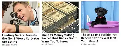There are various clickbait strategies, including the composition of headlines of news and online articles that build suspense and sensation, luring and teasing users to click.[23] Some of the popular approaches in achieving these include the presentation of link and images that are interesting to the user, exploiting curiosity related to greed or prurient interest.[19] It is not uncommon, for instance, for these contents to include lewd image or a "make money quick" scheme.[19]