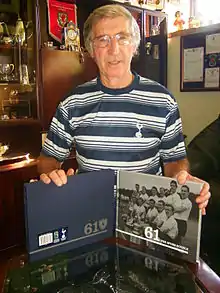 Jones was a key member of the double-winning team of the 1960–61 season, scoring 19 goals that season.[12] He was also part of the successful Spurs sides in the 1962 FA Cup Final and 1963 European Cup Winners Cup Final, and he also won a further medal as a non-playing substitute in the 1967 FA Cup Final.[13][10] In 1962, Juventus offered a world-record fee of £125,000 (equivalent to £2,837,022 in 2021) to sign him but the offer was turned down.[14] Jones played on both wings at Tottenham; he played on the right wing in the Double-winning season, and on the left in the subsequent seasons.[10] He made his final appearance and scored his last goal for Tottenham in the match against Manchester United on 9 October 1968.[7] He remains one of the top scorers in the club's history, scoring 159 goals in 378 games (135 in 318 league games).[15][10]
