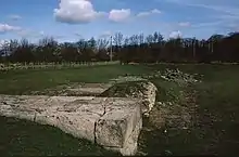 Most of the following are scheduled monuments. The Georgian foundations of the original Cliffe Hall, and the remains of a vicus, lie separately underground nearby.[23][24][25] Medieval noblemen are said to have escaped persecution by going through the mythical Hell Hole tunnel in the cliff to Cliffe Hall.[26] An artefact said to be a market cross is still visible in the fields alongside the mounds where the buildings of the vicus were.[27] However this may be identical with the medieval Cliffe Park wayside cross which is dated 1066 to 1539 and described as follows: "Remains consist of the upper part of the shaft with head and arms set into a modern socket stone. The remains do not appear to be in situ and no indication of its original location".[4][28] Also of archaeological interest is the tumulus known as Betty Watson's Hill.[29] The Piercebridge conservation area does not cover Cliffe due to county boundary limitations.[30] Cliffe forms part of the site of Piercebridge Battle, the "1642 Civil War skirmish between the Earl of Newcastle (Royalist) on the march to York, and Captain Hatham. Both sides had canon, and the Royalists who had canon on Carlbury Hill won the day. Hatham retreated to Tadcaster while the Royalists marched to York".[4][31][32] There is a linear feature, from near Namen's Leazes to near Crow Wood, which goes through Aldbrough, Stanwick St John and Cliffe; it could be an earthwork bank, a defence dyke or a trackway.[4][33] At Cliffe Park there is a double bank earthwork, probably a park pale; and between the banks a small, well-made cobbled track was identified.[4][34]