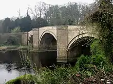The most obvious local landmark is the River Tees on which the village stands. The Grade II listed George Hotel stands near the road-bridge which crosses the Tees coming from Piercebridge, and is said to be the home of My Grandfather's Clock which "stopped short never to go again when the old man died".[4][11][12] The 1789 bridge is the local major crossing since the Roman bridge on Dere Street was destroyed.[13][14] This bridge, of which the northern half is in County Durham and the southern half is in Richmondshire, is close by the old Roman road.[15] Kathleen Wood is next to Cliffe Hall, a surviving Victorian extension of a long-destroyed Georgian mansion. It is now a bed and breakfast establishment.[16][17]